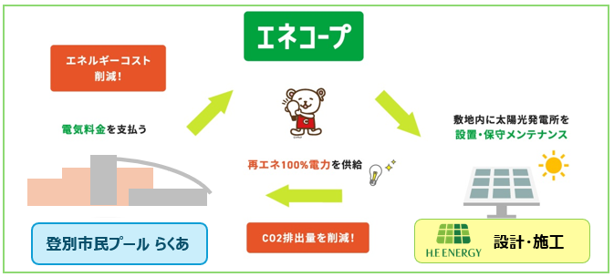 株式会社H.E エナジー(本社:北海道札幌市、代表取締役社長:瀬尾浩史)は、株式会社エネコープ様(本社:北海道札幌市、代表取締役:五十里 浩輔)の「登別市民プール らくあ」へのオンサイトPPAによる太陽光発電設備の整備にあたり、設計・施工を行い、このたび運転を開始いたしました。