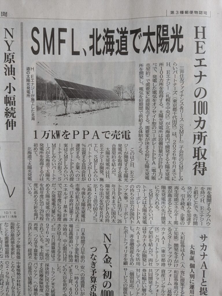 10/8(水)日刊工業新聞にて「北海道エリアにおける年間10MWの太陽光発電所の開発に関する基本合意契約締結について」に関する取り組みの記事が掲載されました。